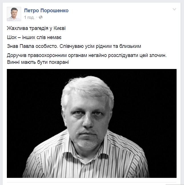 "Ужасная трагедия в Киеве. Шок - других слов нет. Знал Павла лично. Сочувствую всем родным и близким. Поручил правоохранительным органам немедленно расследовать это преступление. Виновные должны быть наказаны", - пишет президент Порошенко.