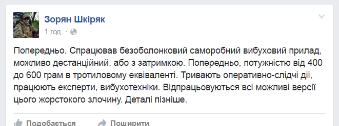 "Предварительно. Сработало безоболочное самодельное взрывное устройство, возможно дистанционный, или с задержкой. Предварительно, мощностью от 400 до 600 грамм в тротиловом эквиваленте", - сообщает Шкиряк в своем Facebook.