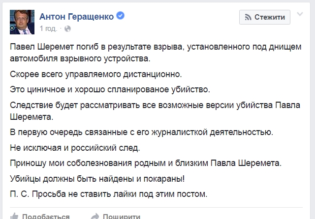 Сообщая детали сегодняшней трагедии в Киеве Геращенко убедительно попросил пользователей ФБ не ставить лайки под данным постом.