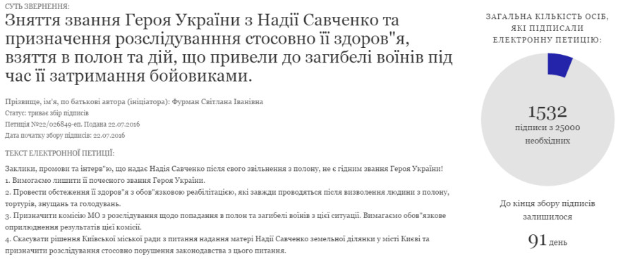 По мнению автора петиции Светланы Фурман, призывы и речи, которые провозглашает Надежда Савченко во время интервью после своего освобождения из плена, не достойны звания Героя Украины.