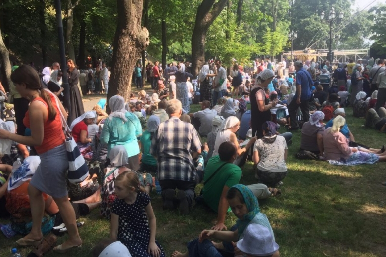 По состоянию на 12.30 среды. 27 июля, более 15 тысяч верующих, участвующих в Крестном ходе, собрались на Владимирской горке для участия в молебне УПЦ МП.