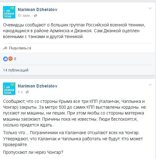 «Очевидцы сообщают о больших группах российской военной техники, находящихся в районе Армянска и Джанкоя. Сам Джанкой оцеплен военными с танками и другой техникой», – написал Джелял в Фейсбуке.