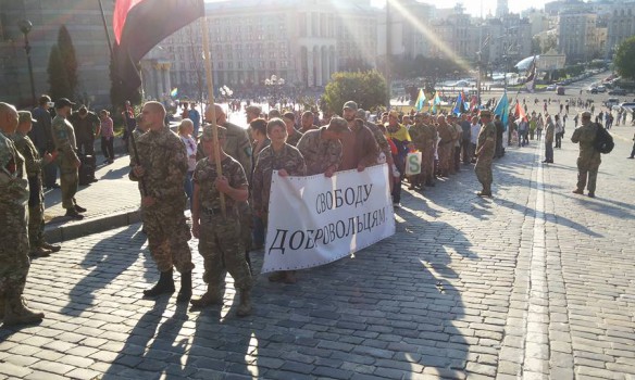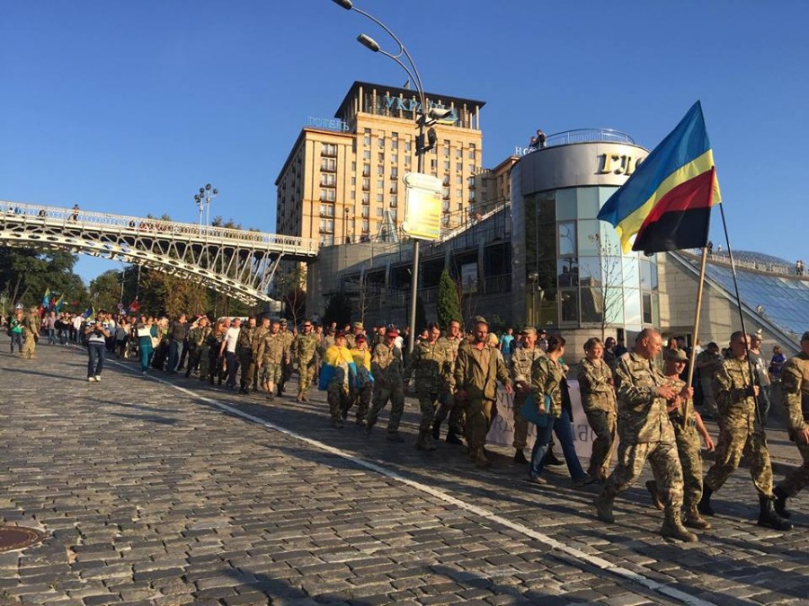 Бойцы колонной прошли от Украинского дома к Администрации президента, где озвучили свои требования, в частности освободить всех "ОУНовцев", которые, по мнению участников марша, на сегодняшний день незаконно задержаны правоохранителями.