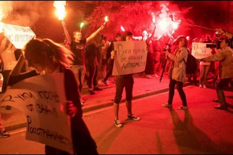 Вечером в субботу, 27 августа, группа из 100 человек устроила акцию протеста у здания посольства Украины в Москве, сообщает ТАСС.