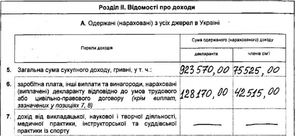 Из них 128 тысяч 170 гривен составила заработная плата. 795 тысяч 400 гривен указаны как "доход от отчуждения движимого и недвижимого имущества".