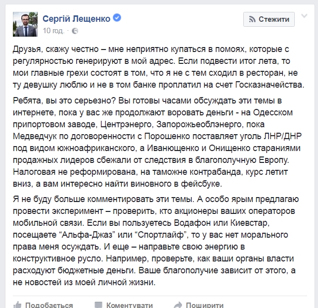 "Я не буду больше комментировать эти темы. А особо ярым предлагаю провести эксперимент – проверить, кто акционеры ваших операторов мобильной связи", - написал Лещенко.