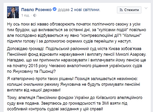 "Пока все живо обсуждают начало политического сезона со всей той грязью, что выливается в последние дни, за "кулисами событий" медленно, но последовательно происходят явно "контрреволюционные действия"! "Бывшие" подняли голову и с помощью отдельных судов перешли в наступление. Докладываю общине. Подольский районный суд Киева обязал Пенсионный фонд возобновить начисление и выплату пенсии Николаю Азарову. Напомню, что мы прекратили начислять и выплачивать ему пенсию еще в начале 2015 года. Ждем аналогичного решения украинских судов по Януковичу и Пшонке?", – написал он.