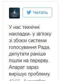 "У нас технические накладки - в связи со сбоем системы голосования Рада, депутаты ранее ушли на перерыв. Аппарат сейчас решает проблему", - сообщается на странице парламента в Twitter.