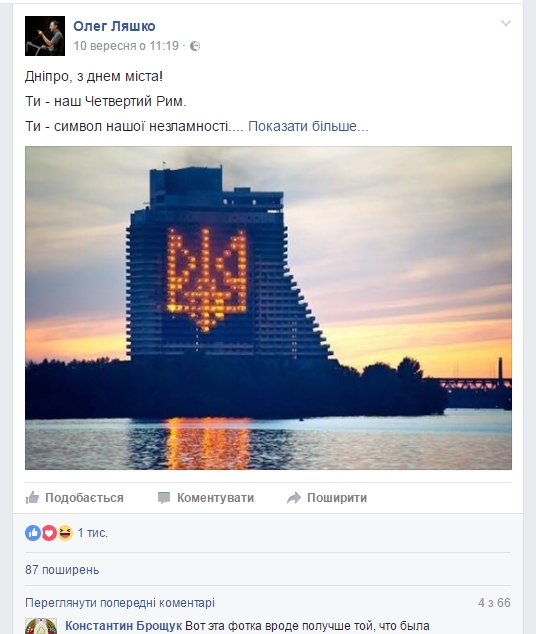 После этого, снимок на странице Ляшко был немедленно заменен на уже днепровский, причем с огромным тризубом. Отчасти это сгладило резонанс, в комментариях начали писать, что это фото получше будет, нежели российско-столичные.