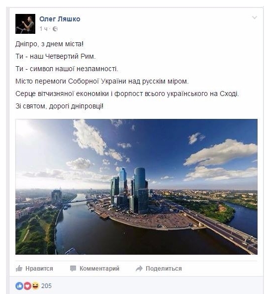 Лидер Радикальной партии в минувший уикенд поздравлял Днепр (бывший Днепропетровск) с Днем города. И все бы ничего, но проиллюстрировал свои поздравления он фотографией, на которой изображен международный деловой центр "Москва-Сити".