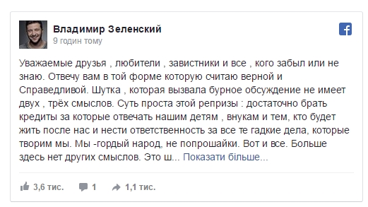 Комик Владимир Зеленский в своем Facebook зпрокомментировал скандал с номером, в котором "95 квартал" показал Порошенко попрошайкой. Шоумен заявил, что хотел не обидеть граждан, а высмеять власть.