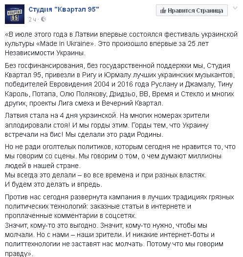 Артисты "Квартала 95" отметили, что благодаря им Латвия, где был показан скандальный номер, стала украинской. Они рассказали, что без государственного финансирования привезли в Юрмалу лучших украинских музыкантов: Руслану, Джамалу, Тину Кароль, Потапа, Олю Полякову, "Дзидзьо", "Вопли Видоплясова" и других.