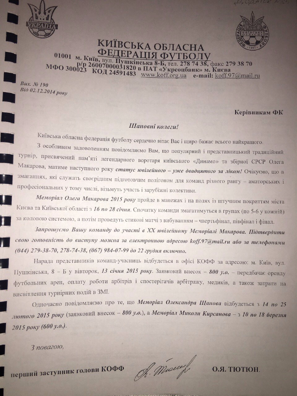 Помимо дотаций от ФФУ, главным источником доходов областных федераций являются взносы футбольных за участие в чемпионатах и региональных турнирах. Только за 2015 год КОФФ должен был получить взносов на сумму более 820 тыс. грн. Однако, по документам в доход федерации поступило чуть более 20% от этой суммы. В лучшем случае Тютюн потворствовал финансовой недисциплинированности членов федерации, а в худшем - присвоил себе эти средства в наличных. Такую гипотезу подтверждает то, что в письме от 4 декабря КОФФ приглашает к участию в турнирах команды и называет суммы обязательных взносов в долларах США, без указания номеров банковских счетов для перевода средств (фото документа во вложении).