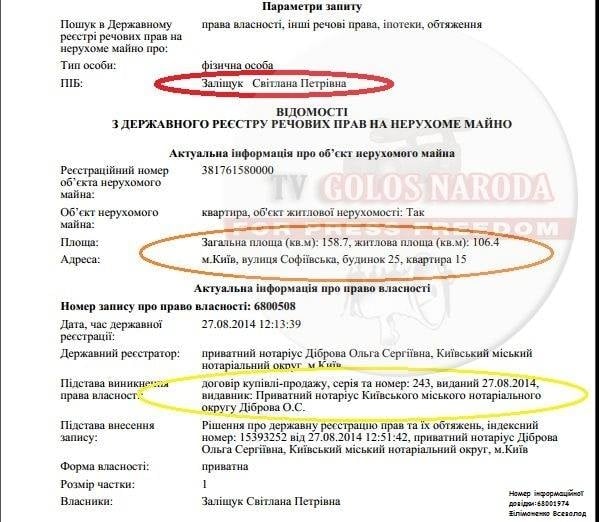 "Подавая в 2014-м декларацию за 2013 год, Залищук решила подстраховаться и внесла в документ заведомо ложные данные о наличии недвижимого имущества, указав, что еще 2013-м в ее собственности находилась не одна квартира, а две - площадью 41 и 158 метров (квадратных - Ред.), не уточнив при этом месторасположение хатынок", - подчеркнул он.