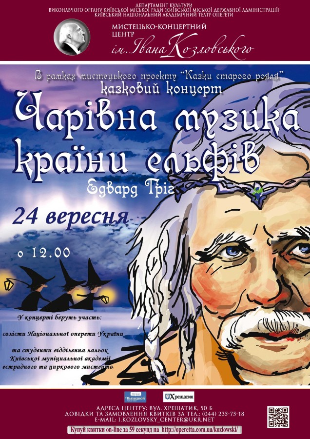 24 сентября в 12.00. в МКЦ им. Ивана Козловского покажут музыкальную сказку для детей «Чарівна музика країни ельфів. Едвард Гріг» («Волшебная музыка страны эльфов. Эдвард Григ»).