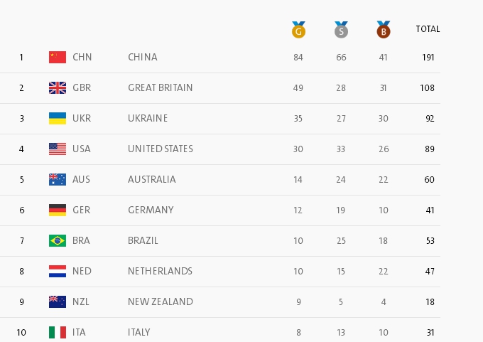 Первое место в общекомандном рейтинге занимает Китай со 191-й медалью (84+66+41), вторыми идут британцы – 108 наград (49+28+31). Четвертое место у сборной США – 89 медалей (30+33+26).