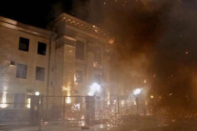 В посольстве РФ добавили, что возгорание не произошло "по счастливой случайности". По информации российских дипломатов, украинские полицейские никого не задержали.