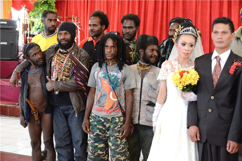 Потом подтянулись «окультуренные» папуасские семьи, а в конце церемонии священник предложил и нам запечатлеться на свадебной фотографии. Как-то сразу растерялись, а потом опомнились и решив, что хоть мы и не в свадебных нарядах, а всё не хуже папуасов и вышли ко всеобщей радости на «большую сцену», отдав предварительно фотокамеру профессионалам. При виде нас народ развеселился и охотно присоединялся для съёмки. Так мы стали звёздами!