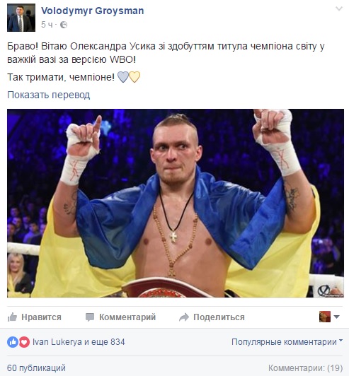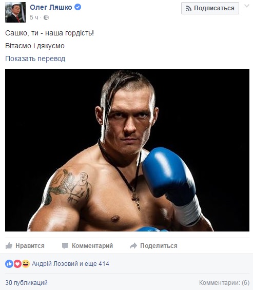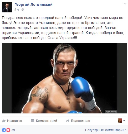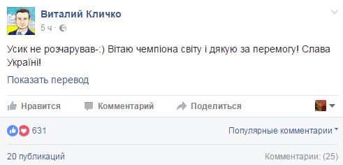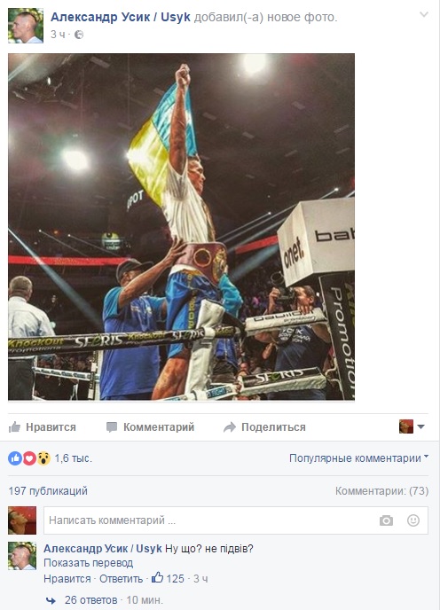 "Саша,спасибо!!!!!! и прости тех неумных,которые тут слюной брызгали! Слишком нерв оголен и разум от боли затуманен .Крымчане все понимают и болеют за тебя! Крым с тобой! И Украина конечно же с тобой и любит и верит !", "Саша, ты великий боксер и великий ЧЕЛОВЕК, пример всем украинцам как быть гордым, любить свое но при этом относиться с уважением и доброжелательностью к другим. Я уверена, что твой пример вдохновляет многих людей стать добрее, лучше. Продолжай нести этот позитив и луч надежды. А на "диванных патриотов" не обращай внимания! Благодарим всей страной!!!!", "Саша, благодарю и искренне поздравляю, ты герой!! Я все 12 раундов ерзал и подскакивал, боялся, чтоб ты под удар Кшиштофа не подставился, но ты молодец, скакал вокруг него, налетал как коршун и тут же отскакивал. Очень горд за тебя! Слава Украине!", - отвечают поклонники боксера на его вопрос.