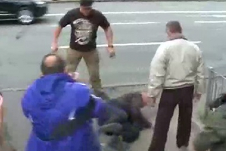 "Полицейские пытаются оттеснить протестующих, чтобы те не мешали избирательному процессу, но пока продолжается словесная перепалка…. Происходит драка… Мужчину несколько раз избили ногами", – отметил корреспондент.
