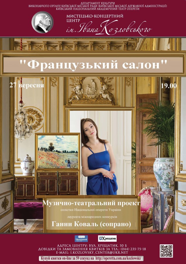 27 сентября в 19 часов в Центре им. Ивана Козловского (Крещатик, 50-б, филиал Национальной оперетты Украины) состоится музыкальный вечер «Французский салон». В новом музыкально-театральном проекте лауреатов международных конкурсов - солистки Национальной оперетты Украины Анны Коваль (сопрано) и Николая Чикаренко (фортепиано) также принимает участие тенор Сергей Андрощук.