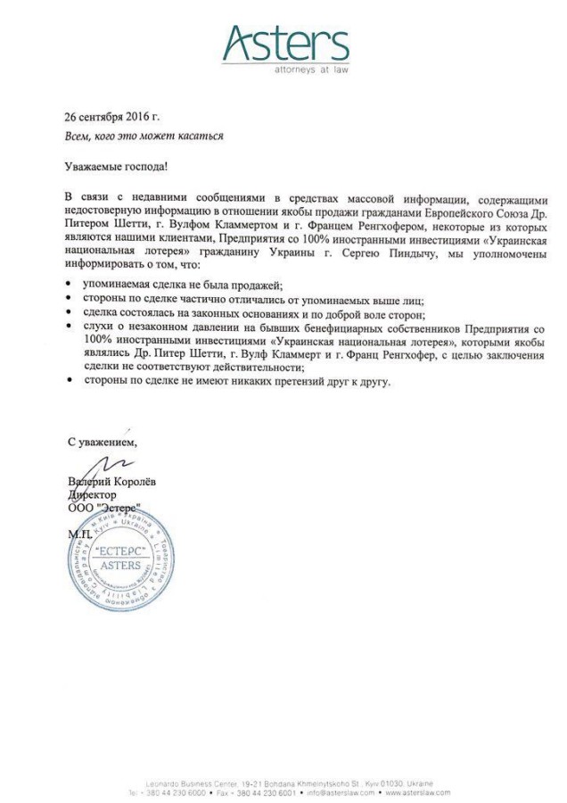 – У зв’язку з недавніми повідомленнями в засобах масової інформації, що містять недостовірну інформацію щодо нібито продажу громадянами Європейського Союзу Пітером Шетті, Вулфом Кламмертом і Францем Ренгхофером, деякі з яких є нашими клієнтами, Підприємства з 100% іноземними інвестиціями Українська національна лотерея громадянину України Сергію Піндичу, ми уповноважені офіційно інформувати про те, що: