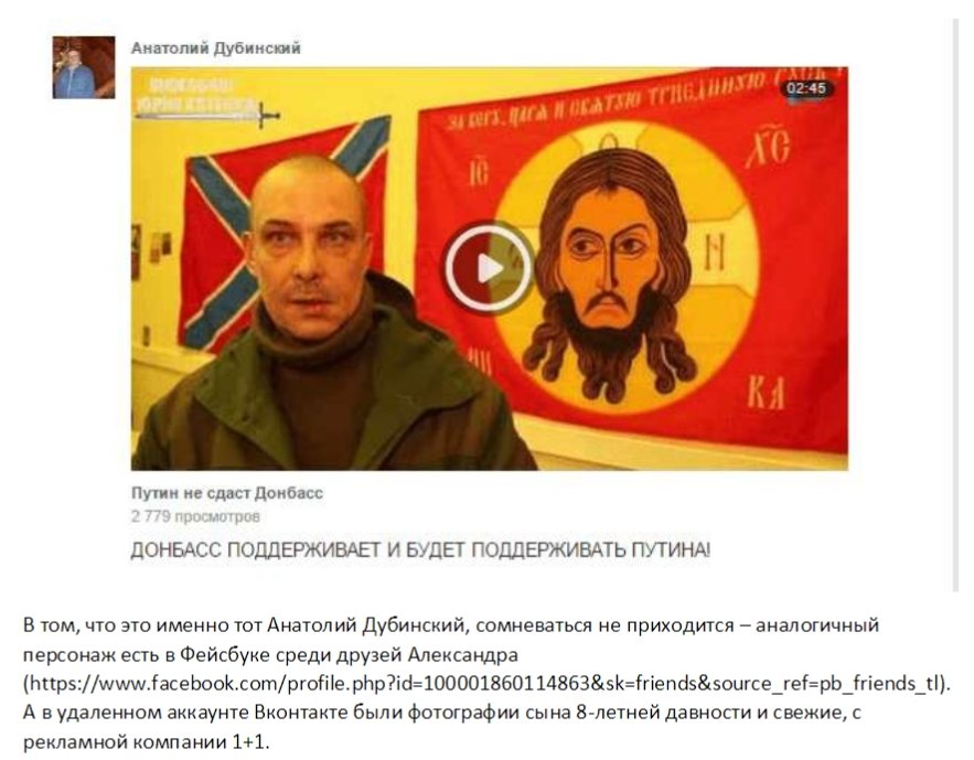 В том, что это именно тот Анатолий Дубинский, сомневаться не приходится – аналогичный персонаж есть в Фейсбуке среди друзей Александра (https://www.facebook.com/profile.php?id=100001860114863&sk=friends&source_ref=pb_friends_tl). А в удаленном аккаунте Вконтакте были фотографии сына 8-летней давности и свежие, с рекламной компании 1+1.