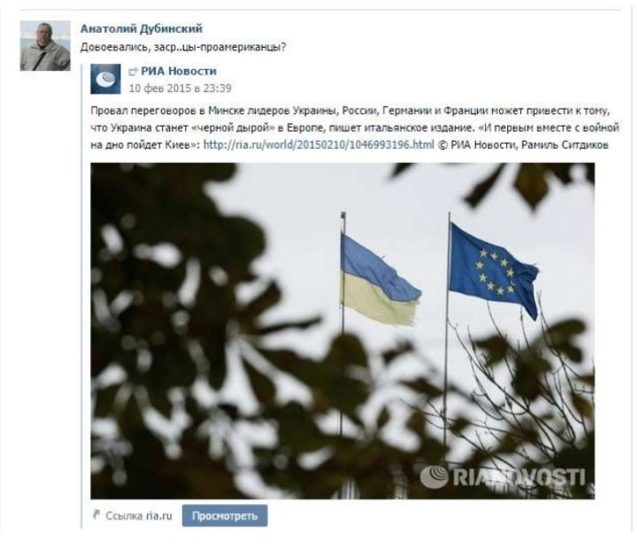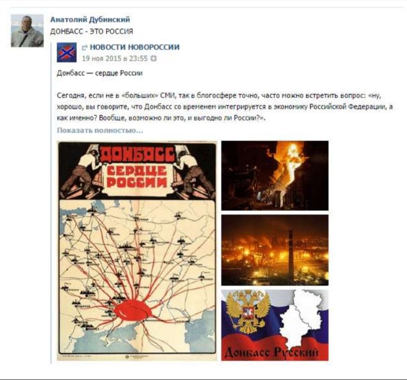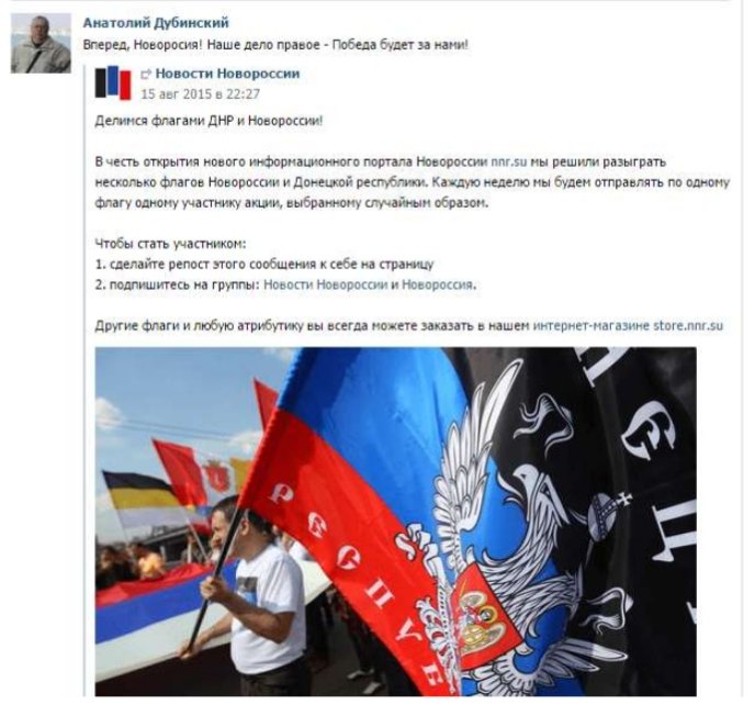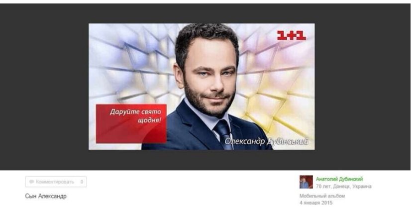 Семья известного украинского журналиста Александр Дубинского, ведущего программы «Гроши» на «1+1» поддерживает террористов и оккупацию Донецка. Такие выводы можно сделать из содержания аккаунта отца Александра, Дубинского Анатолия Иосифовича, проживающего с супругой в Донецке. (https://vk.com/id186368153)