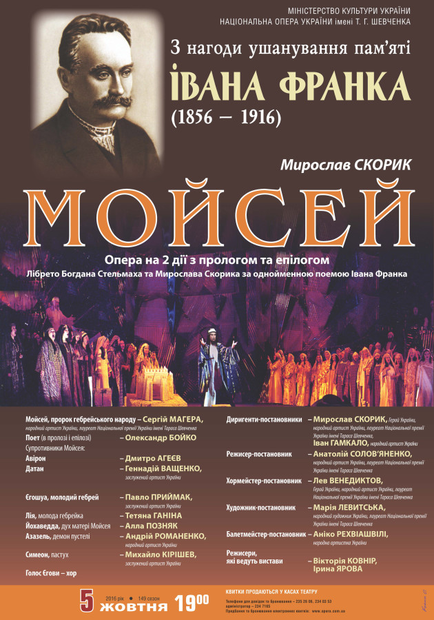 По случаю чествования памяти выдающегося украинского поэта и общественного деятеля Ивана Франко (1856-1916) - выдающегося украинского поэта и общественного деятеля, Национальная опера Украины представляет оперу «Моисей».