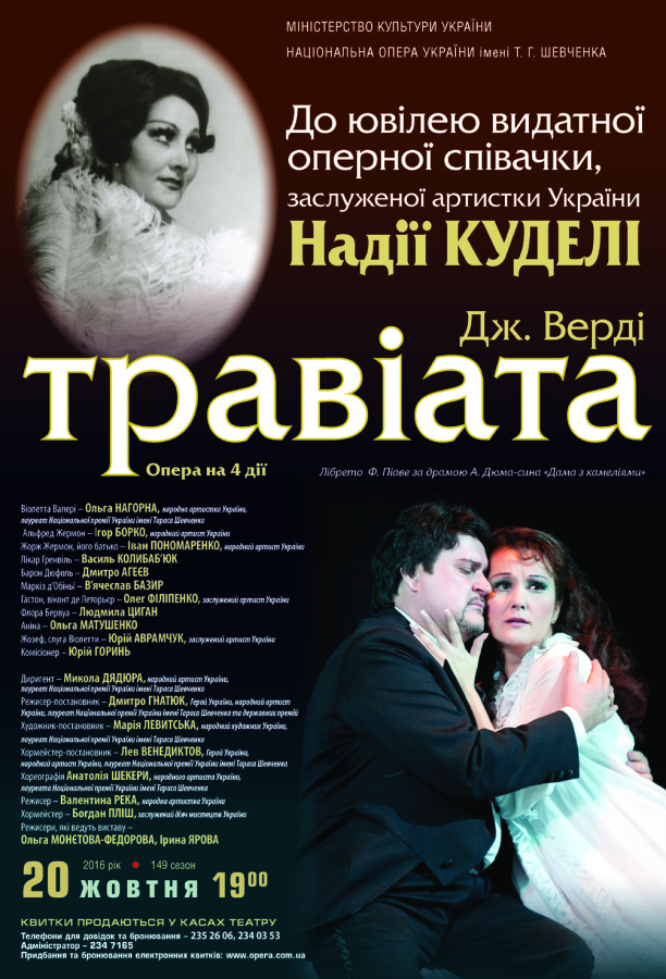 Опера, написанная по сюжету романа Александра Дюма-сына «Дама с камелиями», стала одной из любимых у зрителей столицы. На этот раз «Травиата» посвящена юбилею выдающейся оперной певицы, заслуженной артистки Украины Надежды Кудели. На протяжении десятилетий в этом спектакле она была партнершей выдающегося тенора Анатолия Борисовича Соловьяненко. Своеобразную эстафету мать передала дочери – Ольге Нагорной, которая исполнит главную партию Виолетты Валери. Также в спектакле задействованы: Игорь Борко (Альфред Жермон), Иван Пономаренко (Жорж Жермон) и другие.