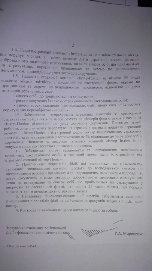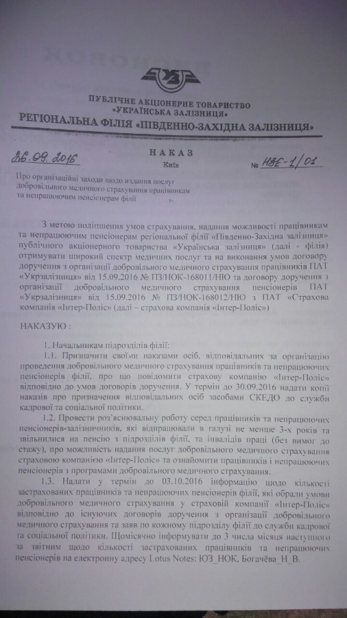 Однако вот такой ход дел боссов регионального филиала «Юго-Западная железная дорога» не устраивал – изданным Русланом Мироненко 26 сентября 2016 года приказом работников государственного предприятия прямо принуждают к страхованию только в компании «Интер-Полис».