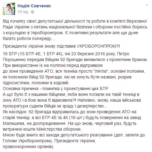 "16 БТР (15 БТР 4E, 1 БТР 4К), которые 23 марта 2016 Петр Порошенко передал бойцам 92 бригады, оказались с проектным браком. При использовании их на полигоне перед отправкой в зону проведения АТО, вся техника просто "легла", основные поломки, как объяснили бойцы 92 бригады, которые не хотят быть названы, разрыв гидросистемы, поломки в ходовой. Основная причина - ошибка в проектировании этих БТР", - заявила Савченко.