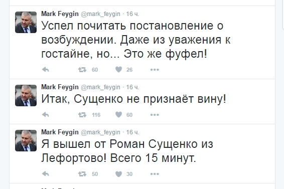 "Я вышел от Романа Сущенко с Лефортово! Сущенко не признает вину! Успел почитать постановление о возбуждении. Даже из уважения к гостайне, но ... Это же фуфел!", - написал он.