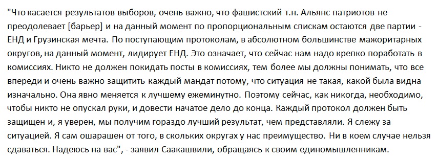 Он подчеркнул, что главное сейчас защитить каждый голос и каждый протокол, так как результаты, которые показали экзит-полы, оказались неожиданными и для него, передает "Грузия Online". По словам экс-президента Грузии, согласно экзит-полам, у ЕНД большое преимущество над правящей партией в большинстве избирательных округов.