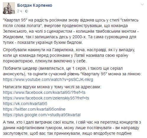 В социальных сетях ряд пользователей негативно отреагировали на пародию от украинских юмористов из "Студии Квартал-95" на народного депутата из фракции "Народный фронт" Михаила Гаврилюка, который так же известен как "казак Гаврилюк".
