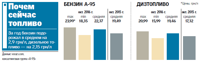 С наступлением холодов началось подорожание нефтепродуктов. За последние дни на ряде АЗС цены на обычный, а не премиальный бензин А-95 поднялись примерно на 40—50 коп., дойдя до 24 грн/л. А-95 улучшенного качества уже стоит там 25,5—26 грн/л. Какие сейчас цены и какими они были год назад – см. инфографику.