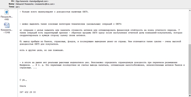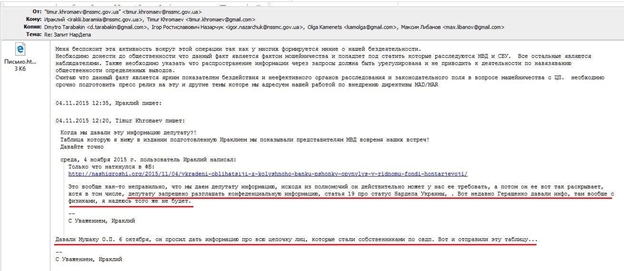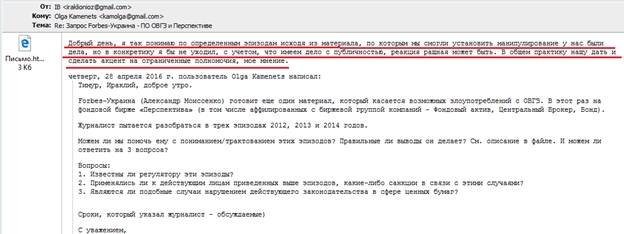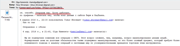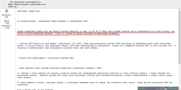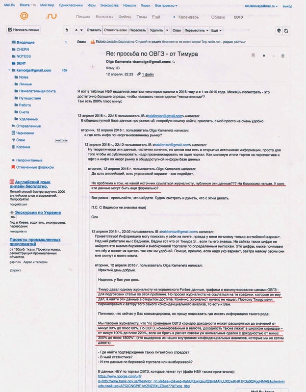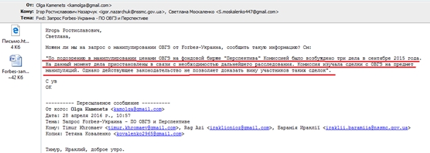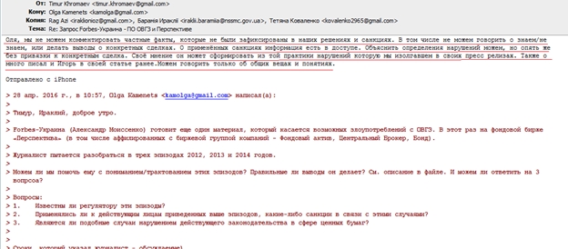 Так, Ольга по поручению господина Хромаева обращается к замдиректора департамента регулирования деятельности торговцев ценными бумагами и фондовых бирж НКЦБФР Ираклию Барамия с просьбой помочь легализировать информацию: «Тимур давал одному журналисту из украинского Forbes данные и графики о манипулировании ценами ОВГЗ, но просил не ссылаться на те графики, которые он ему дал, а найти их в открытом доступе. Конечно, журналист ничего не нашел. Поэтому Тимур меня перенаправил к автору того самого конфиденциального анализа, то есть к Вам. На какой источник ссылаться журналисту, публикуя эти данные??? На Комиссию нельзя. У кого эти данные могут быть еще формально?», - интересуется Ольга.