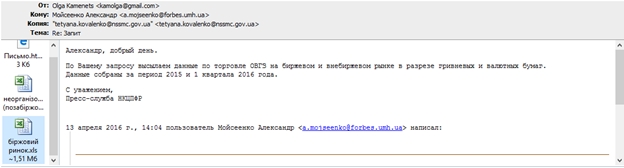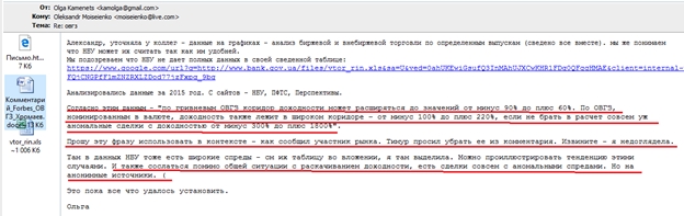 Информация, о которой идет речь в переписке приведена, как и просили, без ссылки на Нацкомиссию: «Так, по данным Forbes, если учитывать технические сделки, то по некоторым гривневым ОВГЗ коридор доходности может расширяться до значений от «минус» 90% до «плюс» 60%. По ОВГЗ, номинированным в валюте, доходность также лежит в широком коридоре – от «минус» 100% до «плюс» 220% (если не брать в расчет совсем уж аномальные сделки с доходностью от «минус» 300% до «плюс» 1800%».