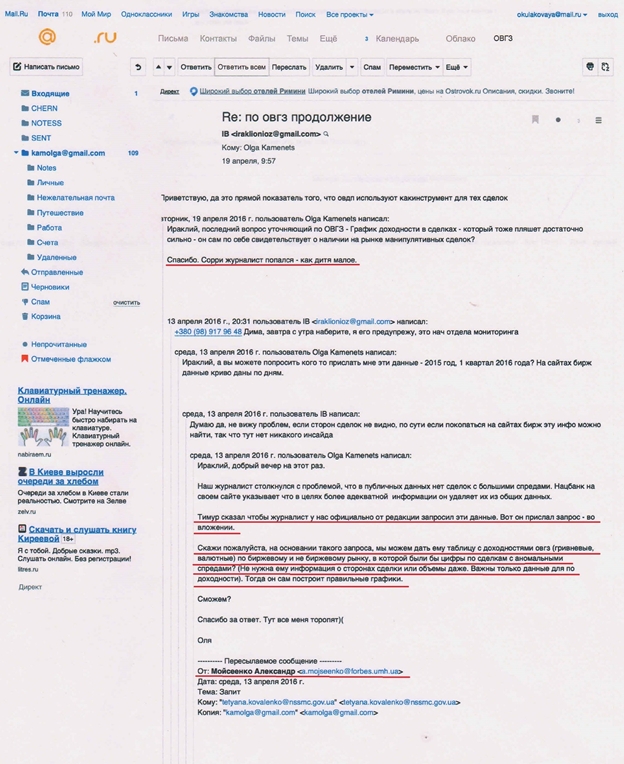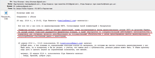 В переписке есть письма сотрудника издания «Forbes» советнику главы Нацкомиссии Ольге Каменец. В профиле Ольги на Facebook указано, что она работает советником по коммуникациям в Нацкомиссии. Ранее, в 2005-2009 годах Ольга трудилась директором по PR в инвестиционных фондах Dragon Capital и Concorde Capital. В переписке Ольга Каменец согласовывает с шефом как передать журналистам конфиденциальную информацию, стоимость предыдущих размещений и темы для разработки новых статей. В апреле за комментарием господина Хромаева по операцям с ОВГЗ обратился журналист Forbes Александр Моисеенко (сейчас обозреватель «Экономической правды»). К слову, в профиле Александра указано, что ранее он также работал в НКЦБФР, правда, не указано, в каких годах.
