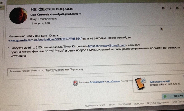 18 августа Тимур Хромаев дает поручение Ольге Каменец срочно готовить фактаж по «той теме», при этом просит ее минимизировать расходы по распространению информации и выбрать «латентный источник». Судя по ответу, таким источником Ольга считает «Украинскую правду» и напоминает, что не сможет публиковать новую информацию, пока не будет закрыт долг за предыдущую публикацию. Вероятно, под «долг 10» имеется ввиду $10 тыс.
