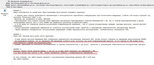 При этом советник Ольга Каменец предлагает заявить от имени Нацкомиссии, что они не передавали в СМИ конфиденциальную информацию и что депутат Мушак должен нести ответственность в рамках украинского законодательства. Чтобы отвести удар от Тимура Хромаева, Каменец предлагает «написать гневное письмо Мушаку, и на базе этого письма дать новость в СМИ». Мало того, что информация конфиденциальная, она еще, судя по тезисам Ольги Каменец еще и искаженная, и подводит к тому, что Нацкомиссия манипулирует инфрпмацией в своих интересах.