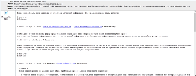После этого начался процесс «легализации» предоставленной информации – журналиста попросили прислать официальный запрос. Чтобы отдать в публичную плоскость конфиденциальную информацию в Нацкомиссии сходятся на том, что информация о сторонах сделки будет скрыта. В конце пиарщица извиняется перед замдиректора департамента за навязчивость, объясняя свои вопросы некомпетентностью журналиста: «Сорри, журналист попался как дитя малое».