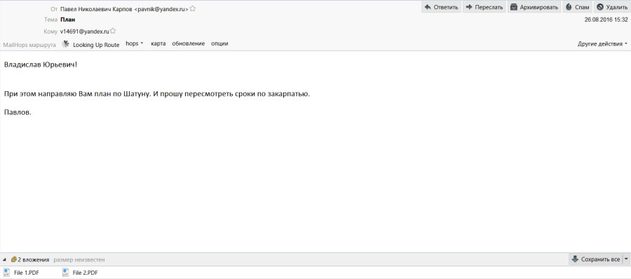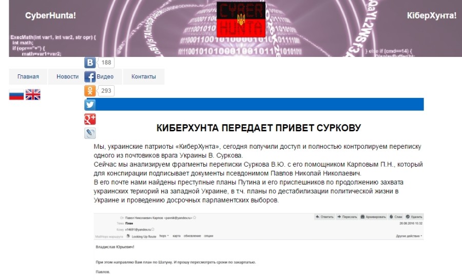 Также в "Киберхунте" отметили, что сейчас анализируют фрагменты переписки Суркова с его помощником Карповым, для конспирации подписывающим документы псевдонимом "Павлов Николай Николаевич".