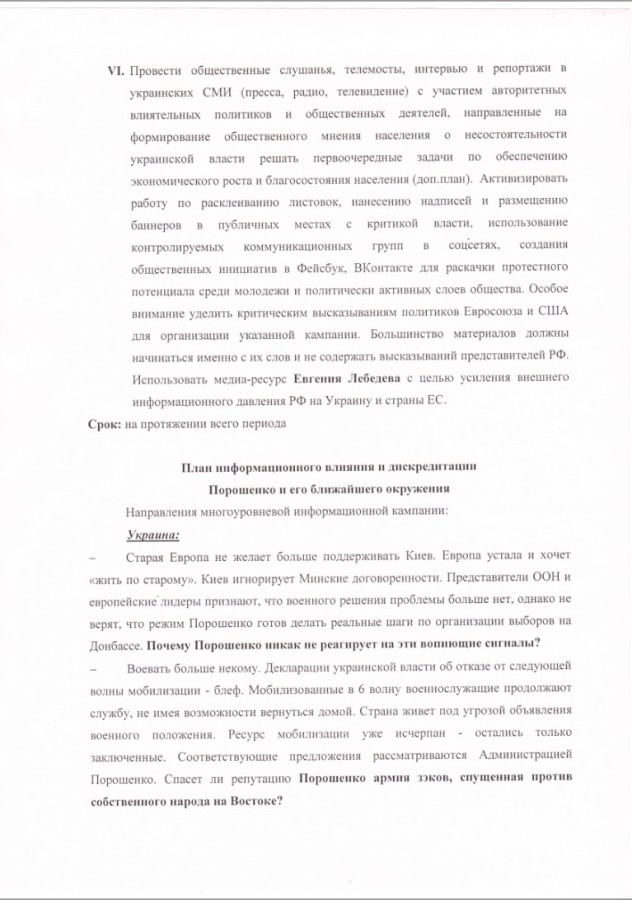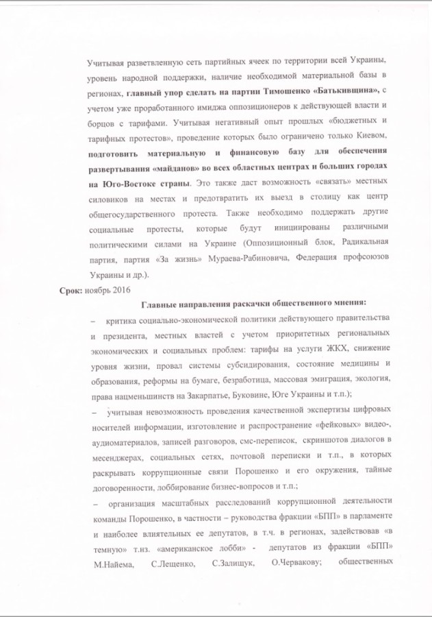 Сурков, как следует из бумаг, делает ставку на активизацию протестного движения, договоренностях с украинской оппозицией: "Оппблоком", Радикальной партией Ляшко и "Батькивщиной" Юлии Тимошенко.