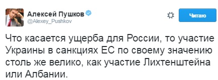 "Что касается ущерба для России, то участие Украины в санкциях ЕС по своему значению столь же велико, как участие Лихтенштейна или Албании", - добавил депутат Госдумы РФ.