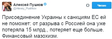 "Присоединение Украины к санкциям ЕС ей не поможет: от разрыва с Россией она уже потеряла 15 млрд., потеряет еще больше. Финансовый мазохизм", - пишет Пушков.