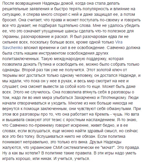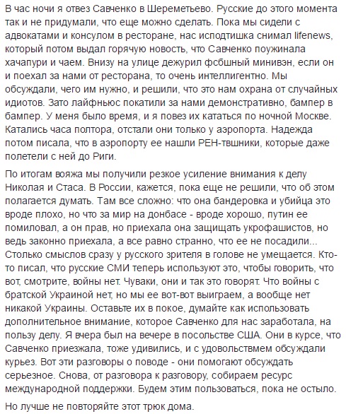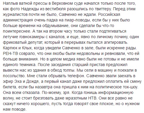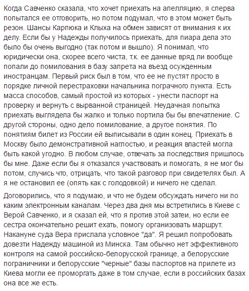"Я сперва попытался ее отговорить, но потом подумал, что в этом может быть резон. Шансы Карпюка и Клыха на обмен зависят от внимания к их делу. Если бы у Надежды получилось приехать, для пиара дела это было бы очень выгодно (так потом и вышло)", - написал адвокат.
