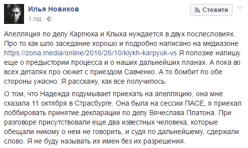 Новиков отметил, что Савченко рассказала ему о своем намерении приехать на апелляцию по делам Станислава Клыха и Николая Карпюка еще 11 октября в Страсбурге.