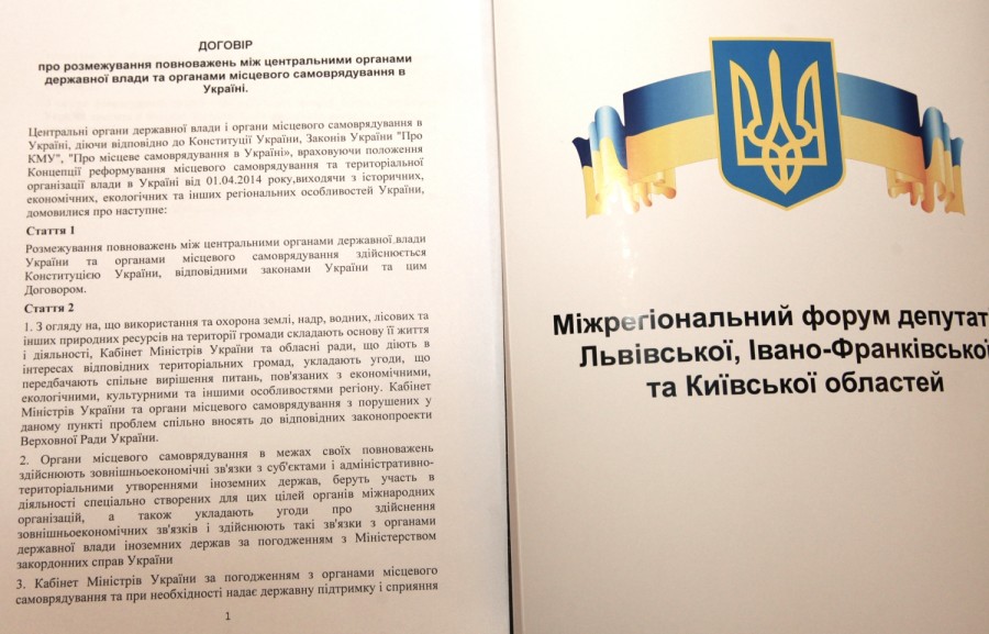 В течение этого года уже 7 областных советов обратились к президенту и КМУ с призывом подписать договор о разграничении полномочий между региональной и центральной властью, сообщил директор Центра исследования общественных инициатив Александр Казмиришин. Комментируя представленный на форуме договор о разграничении полномочий, Казмиришин подчеркнул: «Благодаря таким изменениям, предусмотренным в этом договоре, местные власти получают право распоряжаться своим имуществом и значительной частью бюджетных средств. Больше полномочий, ресурсов и ответственности переходит ближе к людям - в общину. В том числе, право регулировать ставки местных налогов и сборов в зависимости от потребностей региона, решать, как развивать свой регион, назначать руководителей местных правоохранительных и контролирующих органов. Функции представителей президента Украины в регионах должны быть сведены к контролю за соблюдением законов Украины».