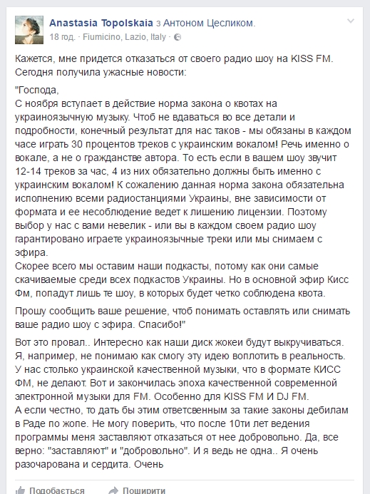 На своей странице в Facebook она заявила, что ей придется с 1 ноября отказаться от своего радио-шоу на KISS FM. Потому вступает в силу закон, который обязывает диджеев каждый час ставить в эфире не менее 30% треков с украинским вокалом.